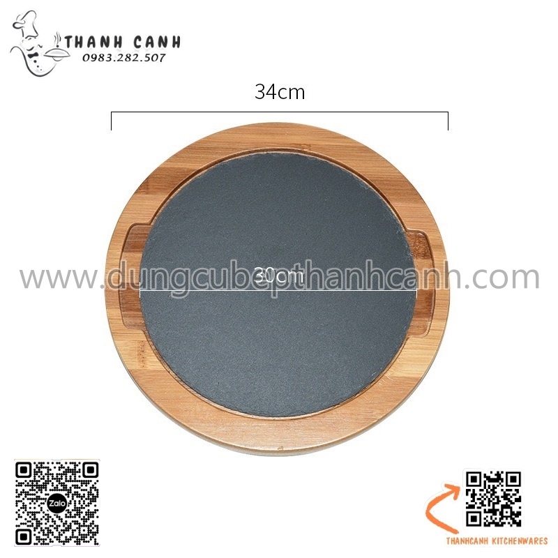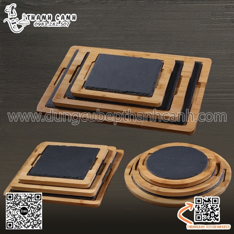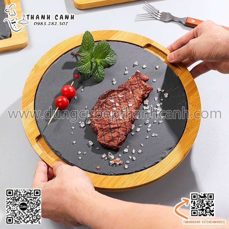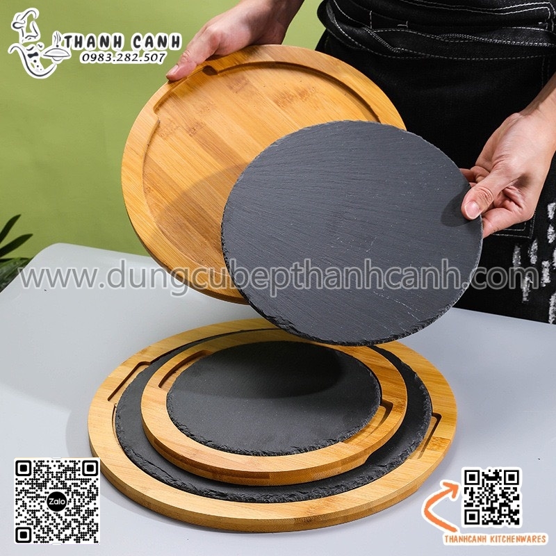 Bộ đĩa đá đen trang trí hình tròn, decor, chụp ảnh thức ăn đi kèm đế gỗ được sử dụng nhiều trong nhà hàng, khách sạn hay những quán ăn. Sự kết hợp giữ gỗ và đá đen nhờ những vân gỗ, vân đá đen tự nhiên giúp cho thức ăn được trưng bày một cách nổi bật, tự nhiên và chân thật nhất.