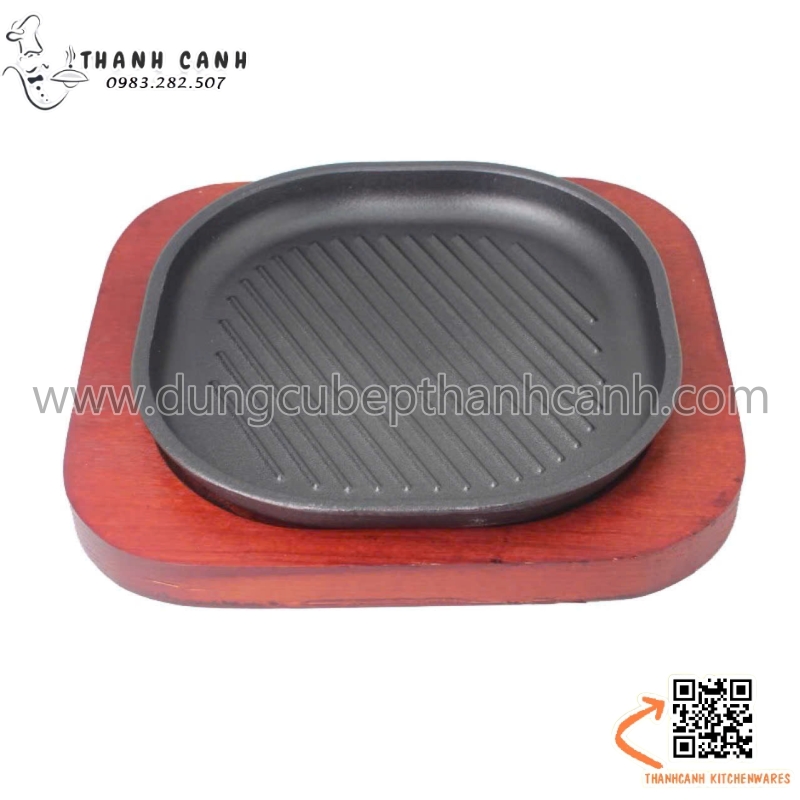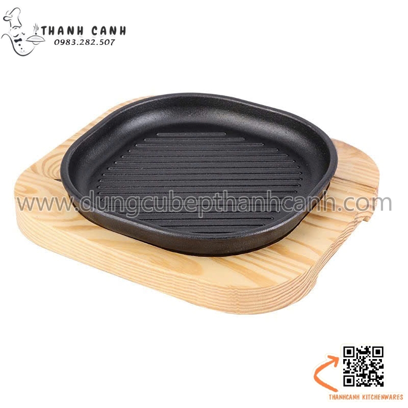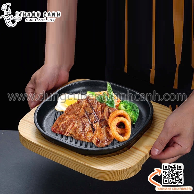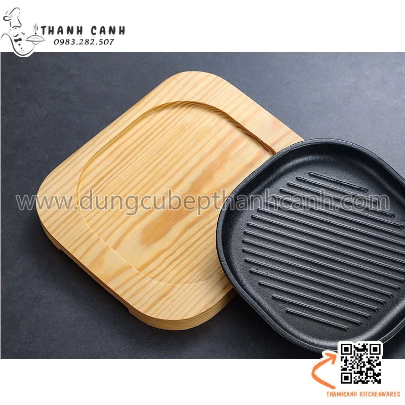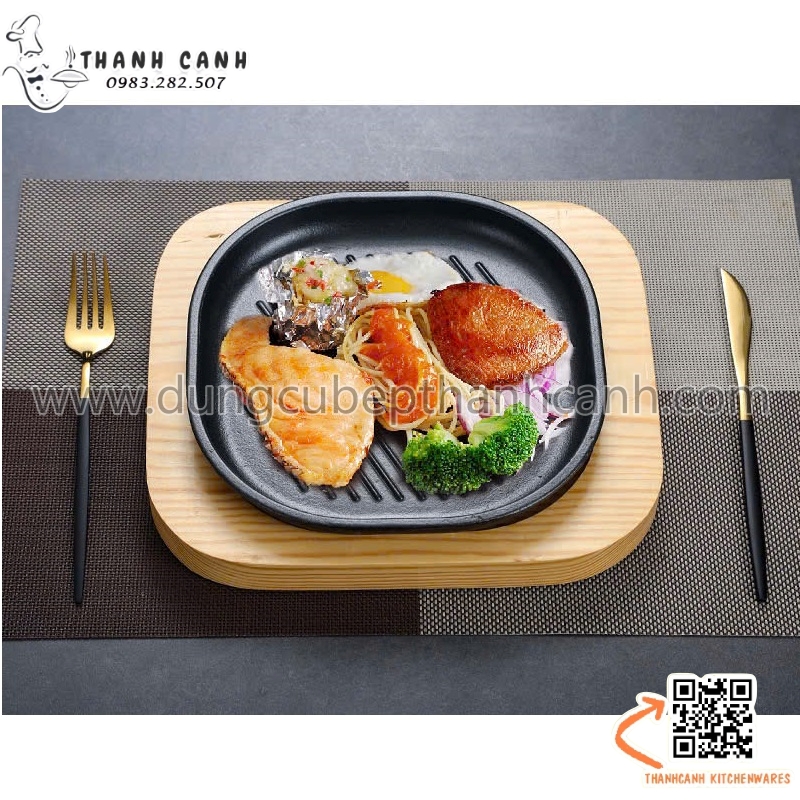 Đĩa gang sâu lòng, Đĩa gang nướng vuông cạnh tròn kèm đế gỗ cách nhiệt