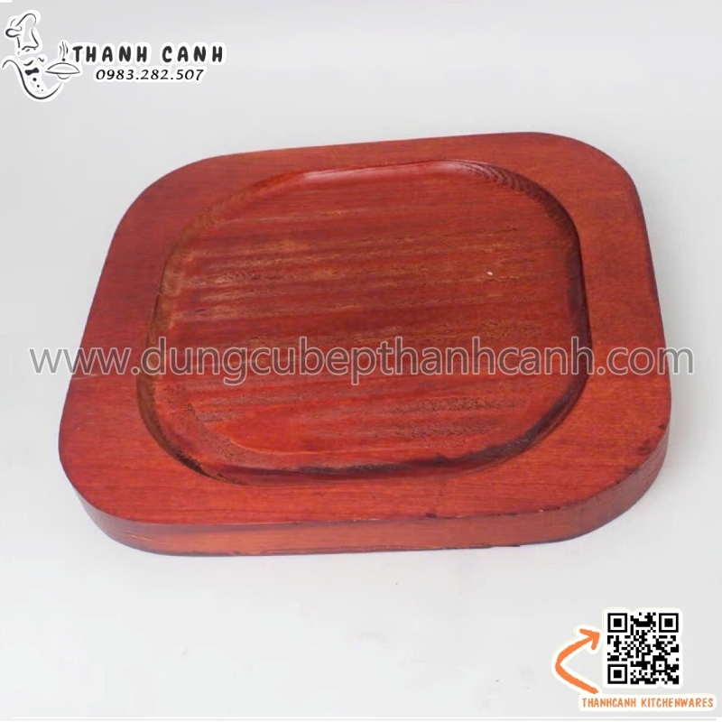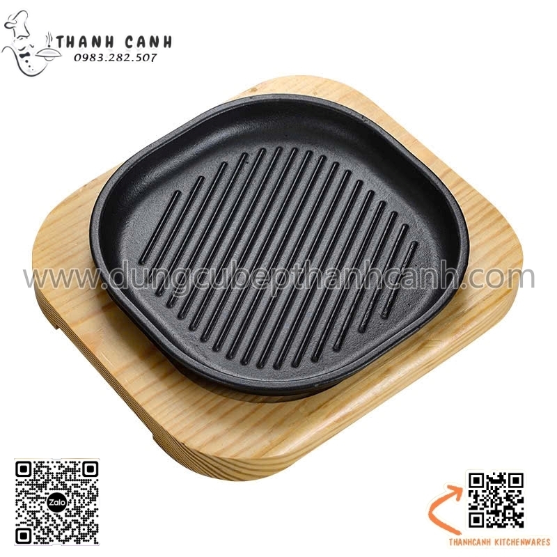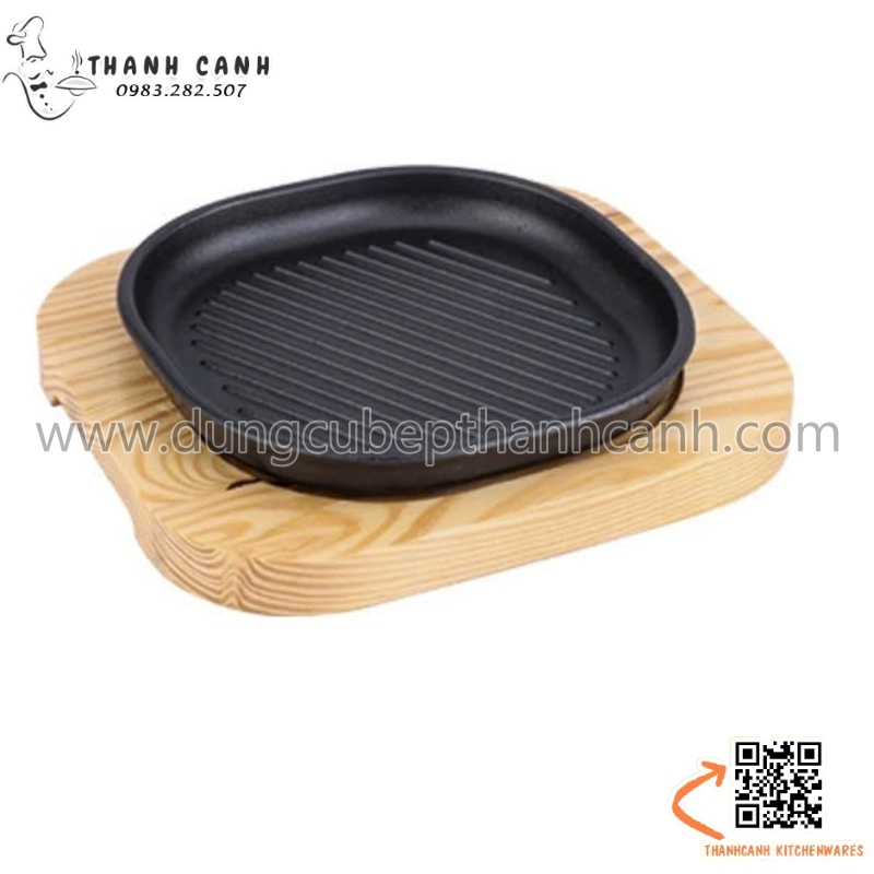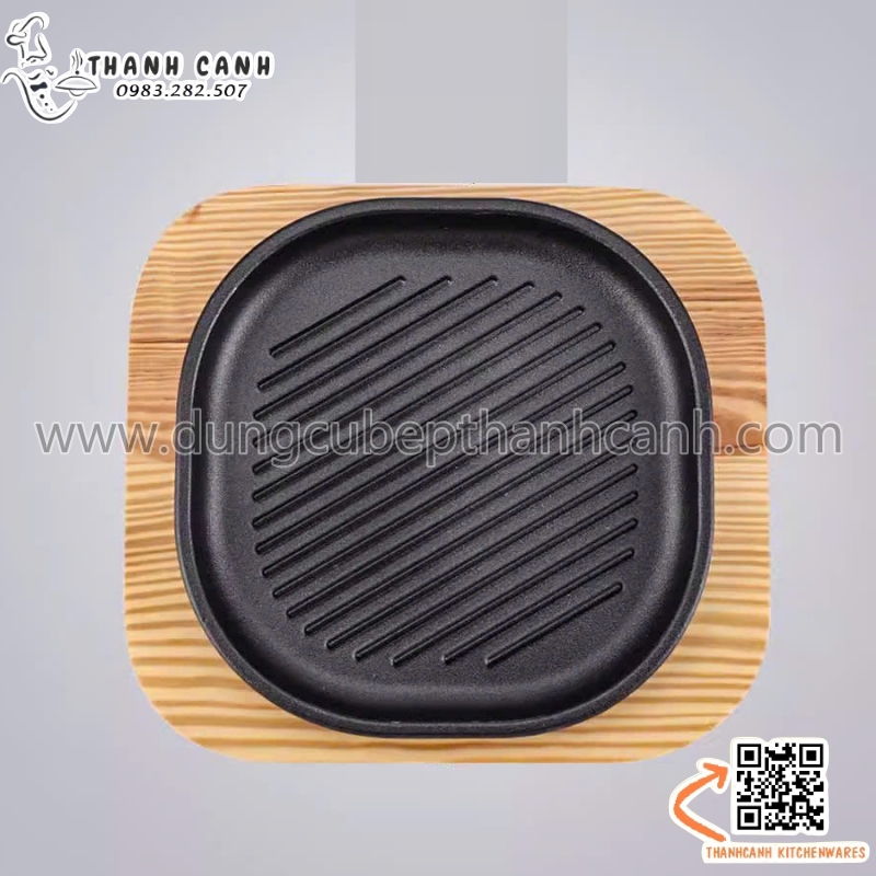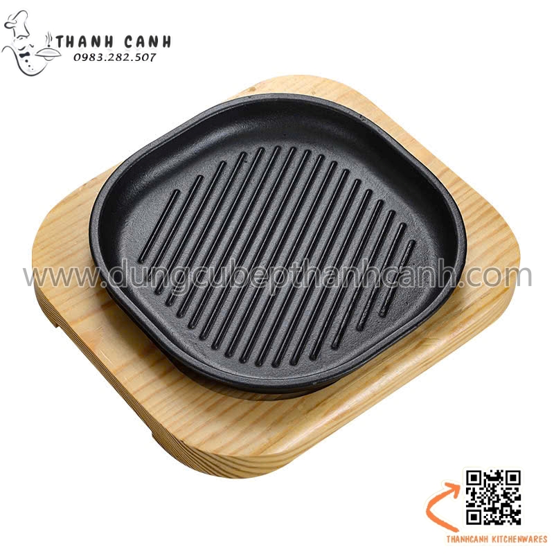 Đĩa gang sâu lòng, Đĩa gang nướng vuông cạnh tròn kèm đế gỗ cách nhiệt