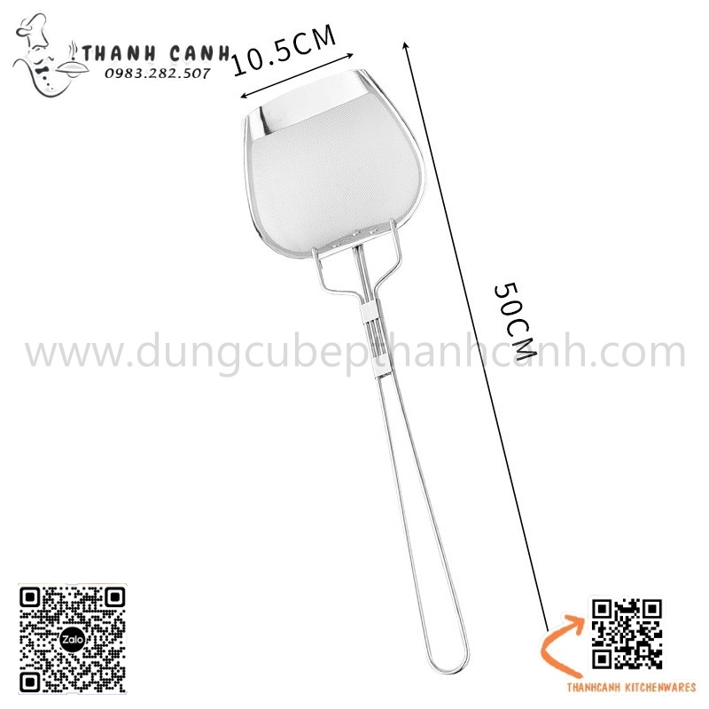 Vợt vớt đồ chiên cán dài , mặt bè thấp bản rộng . Chât liệu INOX không han rỉ, viền inox chắc chắc