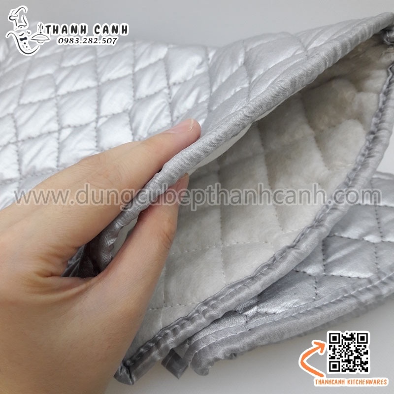 - Với chất liệu vải bông dày, mềm mại, bên trong được độn một lớp bông êm ái, sản phẩm này hoàn toàn đảm bảo chống nóng an toàn cho bạn khi bưng bê đồ vật nóng. Màu sắc tráng bạc sang trọng và nhẹ nhàng, chắc chắn làm tăng thêm tính thẩm mỹ cho căn bếp nhà bạn.