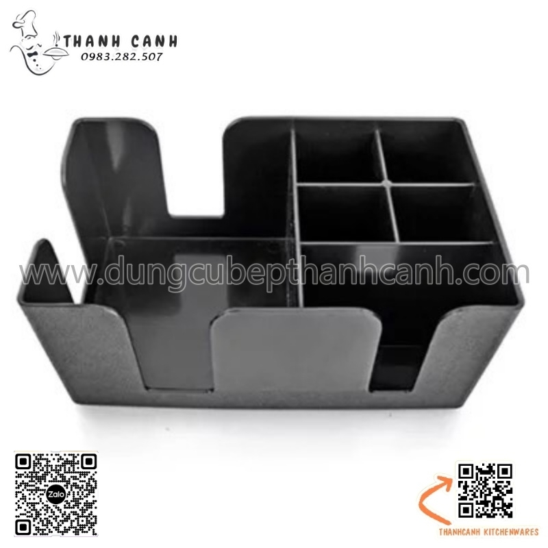 Khay đựng này có chất liệu bằng nhựa bóng mica, có độ cứng cáp và chắc chắn, an toàn cho người sử dụng. Dụng cụ này được thiết kế tinh tế chia thành 6 ngăn bao gồm 4 ngăn nhỏ, 1 ngăn trung và 1 ngăn lớn. Về phần ngăn nhỏ bạn có thể đựng ống hút hay muỗng, ngăn trung và ngăn lớn bạn dùng đựng giấy ăn hay những vật có bề mặt vuông nhỏ vừa vặn cùng khuôn rất thuận tiện. Khay đựng có dạng chữ nhật có kích thước 23cm, 14.7cm, 10.5cm, sản phẩm là màu đen. Đây là một trong những dụng cụ rất hữu ích được dùng để đựng ống hút, cây khuấy, lót ly, ghim trái cây, barspoon, strainer….và các dụng cụ cơ bản trong quá trình làm việc. Đồng thời, giúp cho không gian bếp của bạn trở nên gọn gàng thường được dùng ở quán nước, quán trà sữa,…