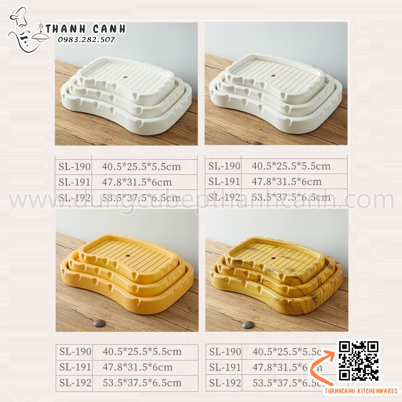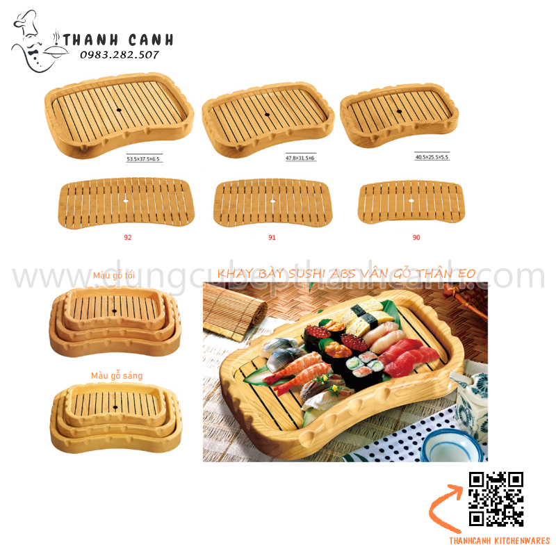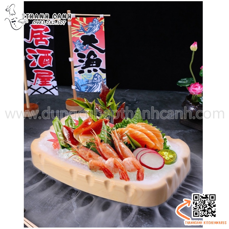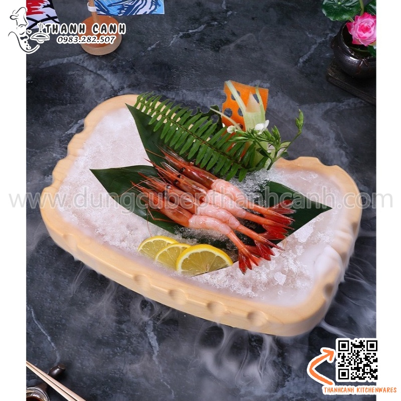 Khay đựng Sushi giả vân gỗ cách điệu chiết eo được dùng để trang trí Sushi Sashimi cá sống trong phong cách trang trí ẩm thực Nhật Bản.