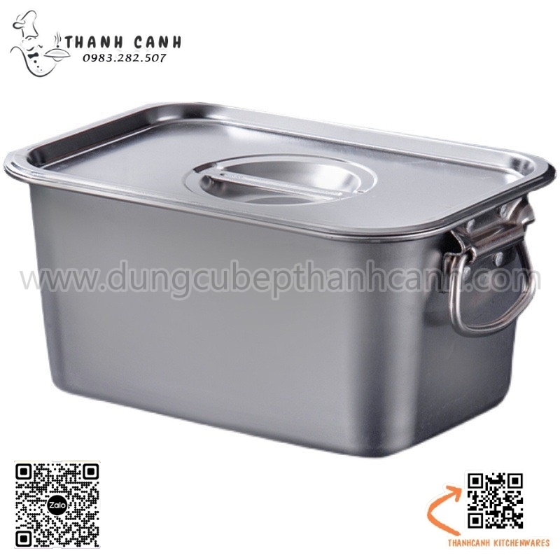 Khay inox có quai dễ dàng bưng bê, di chuyển, lưu trữ nguyên liệu thực phẩm; nắp khay dạng âm, giúp xếp chồng lên nhau dễ dàng.