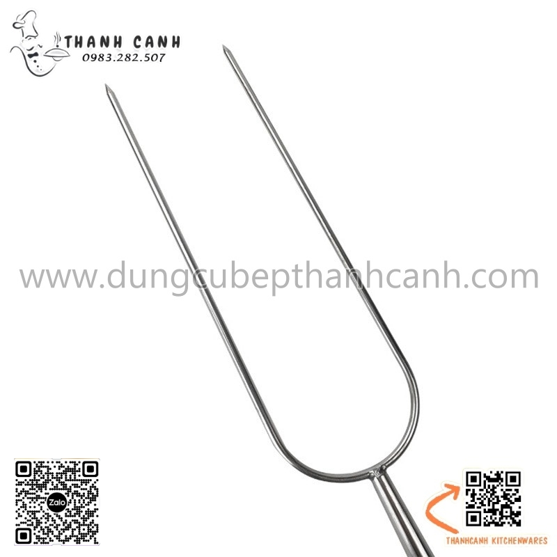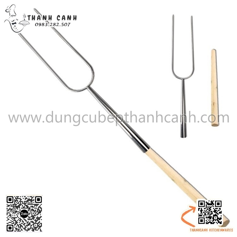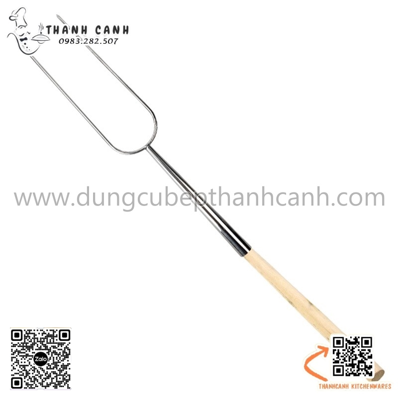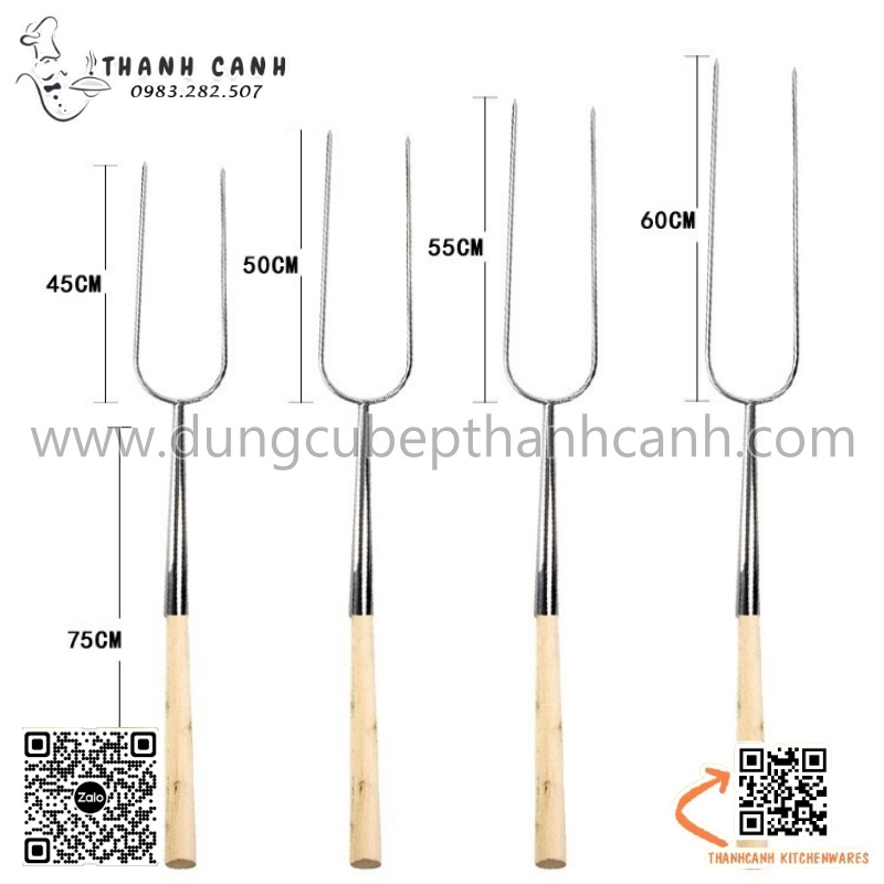 Xiên heo quay, lợn quay, xiên gà nướng, xiên đùi cừu nướng phục vụ tại bàn cán cầm bằng gỗ.Xiên có hình dáng chữ U cán cầm bằng gỗ dài chống nóng, nhiều kích thước khác nhau