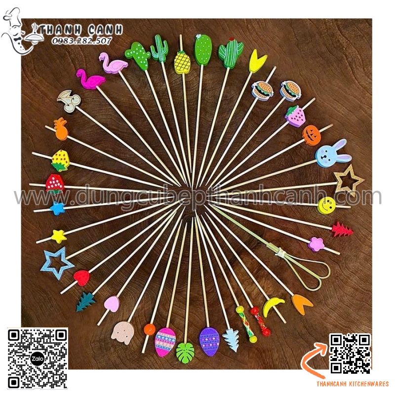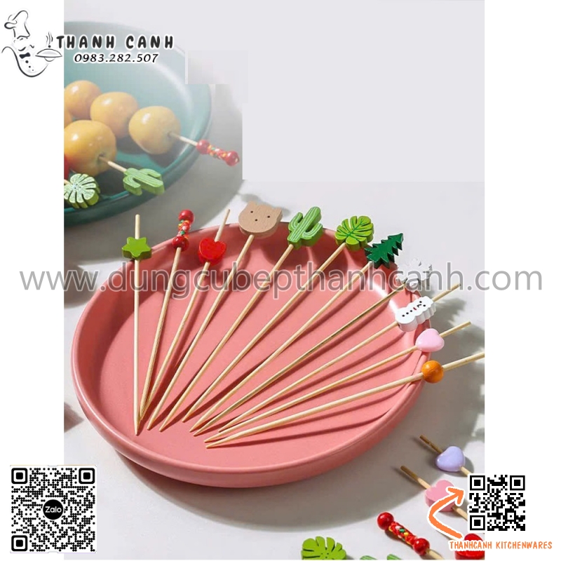 Phần đầu xiên được gắn các chi tiết mini siêu dễ thương như: hình trái cây, động vật, ngôi sao, trái tim, v.v. Không chỉ tiện dụng mà còn tăng tính thẩm mỹ, giúp món ăn trở nên hấp dẫn hơn trong mắt thực khách.